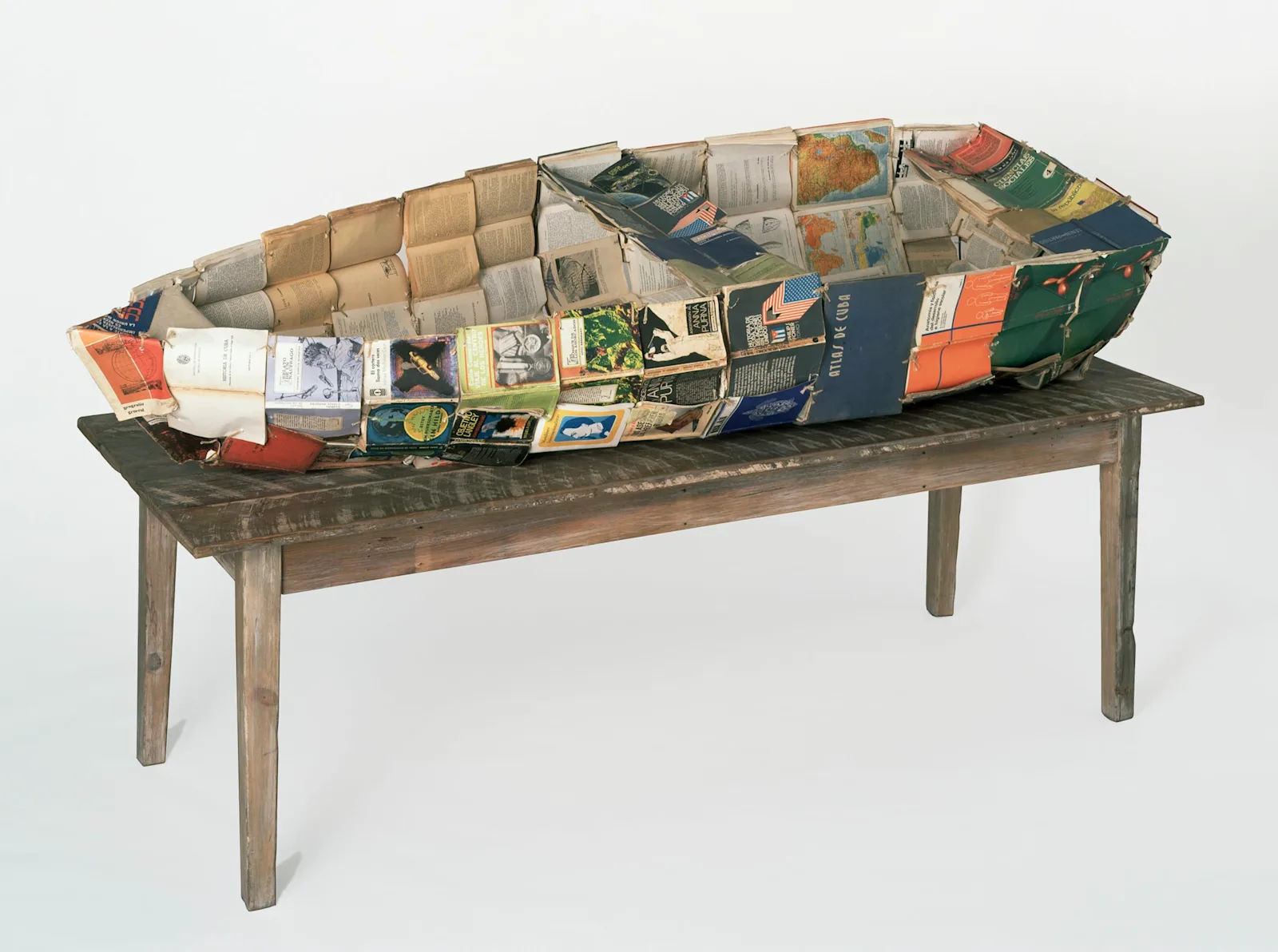Escultura: Libros, estructura metálica, mesa de madera, periódico y cordel.